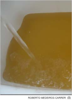 "A única função era a descarga no banheiro e ficou assim durante varias horas. Agora eu me pergunto será que vamos ter desconto na fatura?", questiona. "Coloquei a água em um pote de conserva e esperei decantar para ver o que era. No fundo acumulou uma camada de terra ou material parecido com ferrugem. Não consegui identificar", aponta.