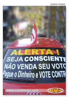 Durante a semana, um carro vermelho chamou a atenção no Centro de Içara. Estacionado em frente ao Shopping Talismã Center, o veículo foi fotografado por diversas pessoas. Uma delas foi o economista Juliano Goulart, o autor da imagem utilizada pelo Canal Içara. "Alerta! Seja consciente. Não venda o seu voto. Pegue o dinheiro e vote contra", diz a mensagem colada no vidro traseiro do automóvel.