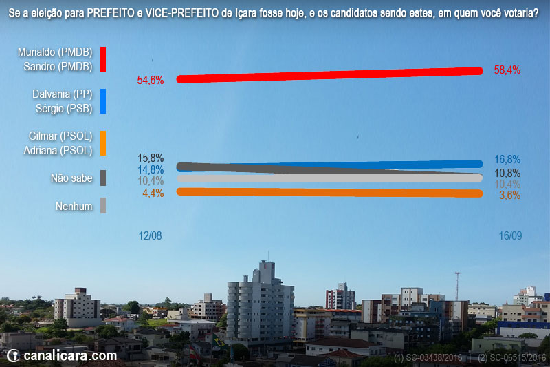 O número de indecisos caiu cinco pontos percentuais nos últimos 30 dias. Para Murialdo Canto Gastaldon (PMDB) e Sandro Giassi Serafin (PMDB), isto significa crescimento de 54,6% para 58,4% das intenções de voto. Dalvania Cardoso (PP) e Sérgio Peruchi (PSB) subiram de 14,8% para 16,8%. Apenas Gilmar Axé (PSOL) e Adriana Fraga (PSOL) tiveram queda, de 4,4% para 3,6%. Ainda não sabem 10,8% enquanto 10,4% mantiveram a preferência pelo voto branco ou nulo. Os números foram apresentados na manhã desta sexta-feira, dia 16.