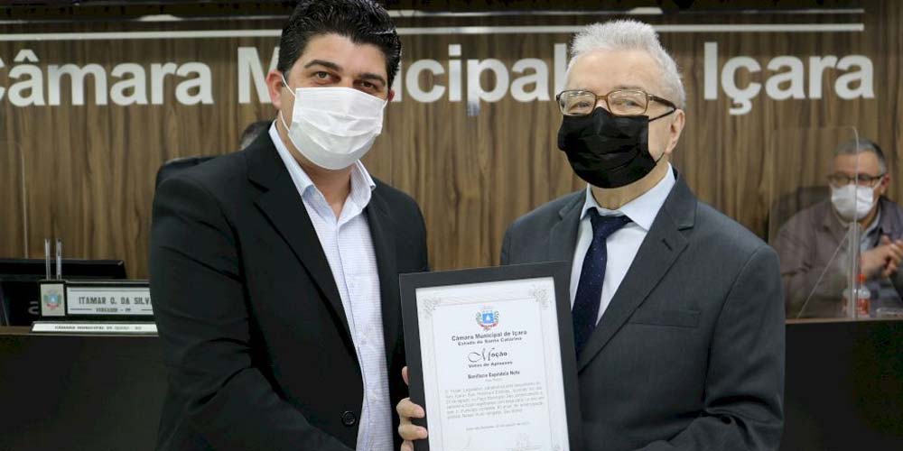 A Câmara Municipal de Içara entregou moção de aplausos ao içarense Bonifácio Espíndola Neto, o seu Bona, na noite desta segunda-feira, dia 30. O ato ocorreu em virtude do lançamento do livro “Içara - Sua História e Estórias”, realizado no dia 25 no Paço Municipal Ângelo Lodetti. “É motivo de orgulho para todos nós. Seu conhecimento e sabedoria ficam registrados neste livro, que apresenta toda a mudança e desenvolvimento do nosso município”, destaca o propositor da homenagem, o vereador Rodrigo da Silva Gonçalves (PP).