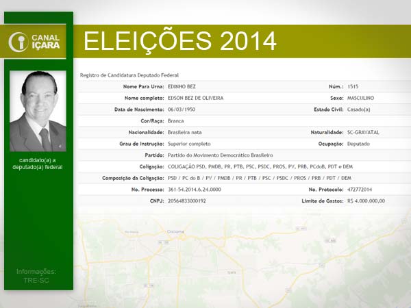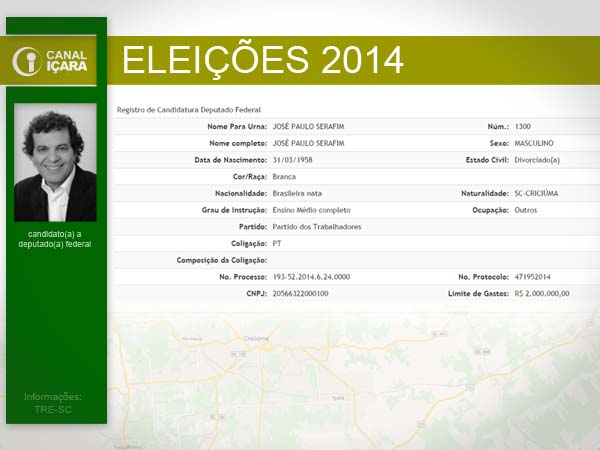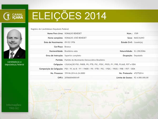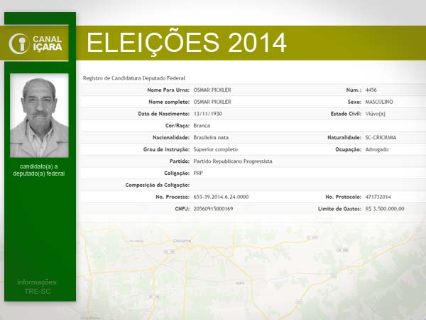 Os catarinenses deverão escolher 16 deputados federais para representar o estado em Brasília (DF). A disputa deste ano envolve 145 pessoas à espera de sufrágios neste próximo dia 5. Isto significa 9,1 candidatos por vaga. A vitória deles nas urnas dependerá do quociente eleitoral, ou seja, da divisão dos votos válidos das legendas pela quantidade de cadeiras disponíveis. Confira na galeria de imagens os postulantes com naturalidade no Sul do estado.