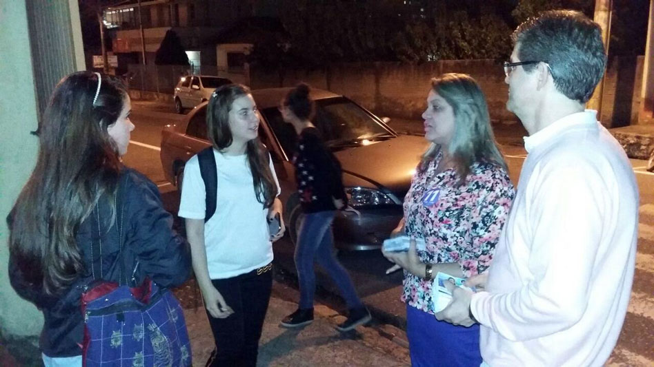 Dalvania Cardoso (PP) e Sérgio Peruchi (PSB) reservaram o início da noite para o contato com a juventude nesta segunda-feira, dia 5. A conversa em frente da Escola Salete Scotti dos Santos foi dedicada a divulgação, por exemplo, da distribuição de R$ 500 mil por mês em bolsas de estudos, implantação de escola integral e a valorização dos profissionais da educação.