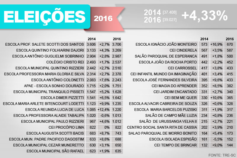 Apenas no Centro de Educação Infantil Procópio Lima não haverá mudança neste ano. Permaneceram inscritos 822 eleitores. Nos demais locais, o crescimento variou de 0,61% no caso da Escola Municipal Alvacir Cabreira de Souza – atualmente com 328 eleitores - até 16,9% na Escola Reunida Ignácio João Monteiro – com 670. Na somatória, por vez, Içara passou de 34.408 votantes em 2014 para 39.027 em 2016, ou seja, teve um incremento de 4,33%.
