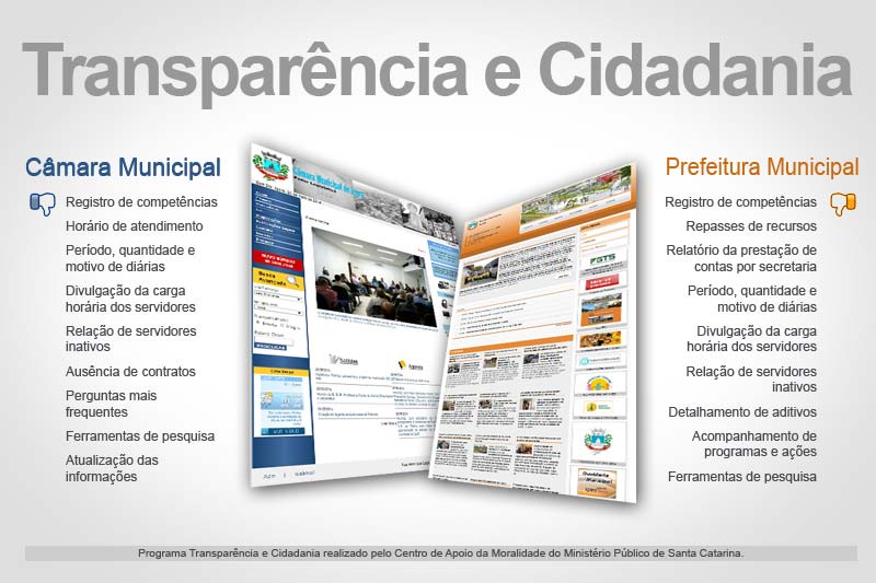 Os sites da Prefeitura e Câmara Municipal foram analisados, respectivamente, em 99 e 105 itens de transparência e cidadania conforme determinado pelas legislações vigentes. E ambos apresentaram falhas. No Legislativo foram constatados 65 problemas enquanto no Executivo foram detectadas 60 inconformidades. Os números estão no relatório realizado pelo Centro de Apoio da Moralidade do Ministério Público de Santa Catarina.