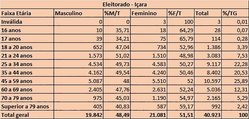 Os números do TSE ainda apontam que a representatividade feminina é composta por 21.081 içarenses, 51,51% do total. Há 19.842 homens cadastrados, compondo os outros 48,49% do eleitorado no município.