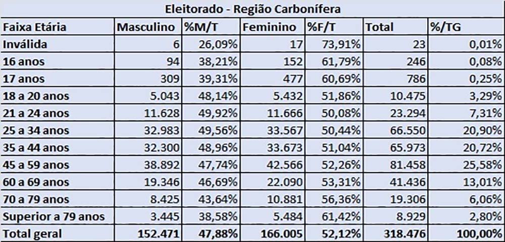 O perfil do eleitorado em Içara é semelhante ao registrado na Região Carbonífera. Na soma, os 12 municípios contam com 318.476 eleitores, sendo 152.471 homens (47,88%) e 166.005 mulheres (52,12%).