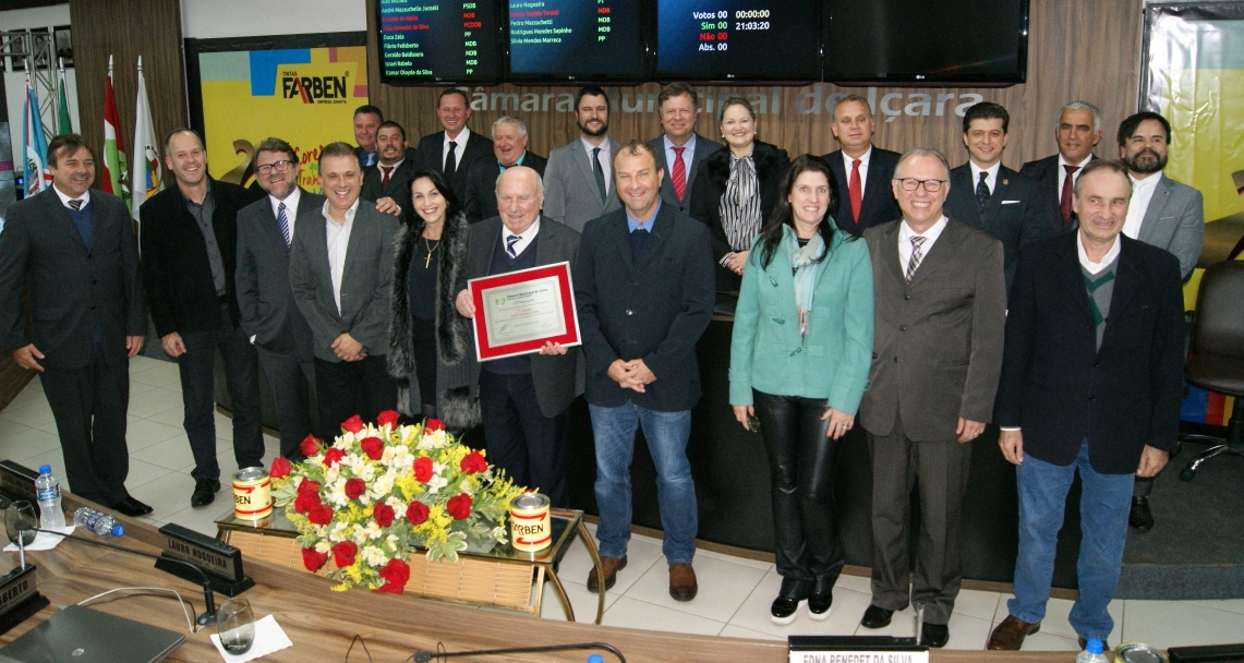 A Câmara Municipal de Içara comemorou os 25 anos da Farben em sessão solene na noite desta quinta-feira, dia 23. “É uma das mais relevantes empresas de nossa cidade e região. Uma indústria forjada na força de seus idealizadores. Que este ato possa representar um incentivo para que outras empresas sigam esse mesmo caminho vitorioso”, frisa o vereador propositor da homenagem, Geraldo Baldissera (MDB). Além de apresentar a história de sucesso da indústria de tintas na cidade, uma placa comemorativa foi entregue ao presidente da empresa, Jayme Antônio Zanatta.