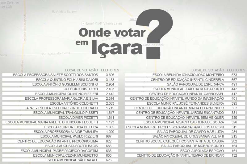 Os 37,4 mil eleitores içarenses utilizarão 36 locais de votação para a composição da Presidência da República, Senado, Câmara Federal, Governo do Estado e Assembleia Legislativa no próximo dia 5. A maior circulação deverá ocorrer na Escola Professora Salete Scotti dos Santos com 3,6 mil pessoas cadastradas em 12 seções. Comparada a última eleição geral [2010] o local terá um acréscimo de 2,32% de votantes. Os dados são do Tribunal Regional Eleitoral.