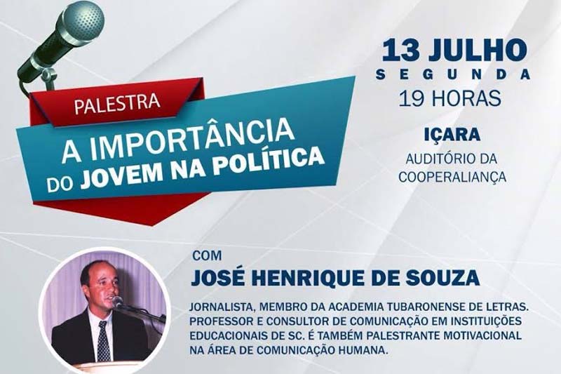 A parceria entre a Juventude do Partido Progressista e a Fundação Milton Campos traz para Içara a palestra “A importância do jovem na política” com José Henrique de Souza. O jornalista também é integrante da Academia Tubaronense de Letras, professor e consultor em comunicação em instituições educacionais de Santa Catarina. O encontro será no auditório da Cooperaliança nesta próxima segunda-feira, às 19h.