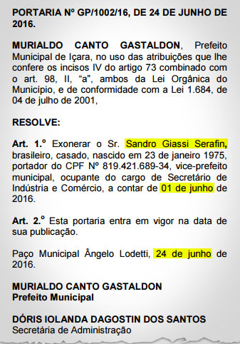 Sandro Giassi Serafin (PMDB) teve o registro deferido pelo juiz Fernando de Medeiros Ritter nesta terça-feira, dia 20. Contra ele havia pedidos de impugnação do Ministério Público e da coligação Com o Povo (Dalvania e Sérgio). Ambos baseados na exoneração da Secretaria da Indústria e Comércio fora do prazo para a desincompatibilização. A portaria ocorreu em 24 de junho, contudo, com efeitos retroativos ao primeiro dia do mesmo mês. Da decisão de primeira instância ainda cabe recurso.