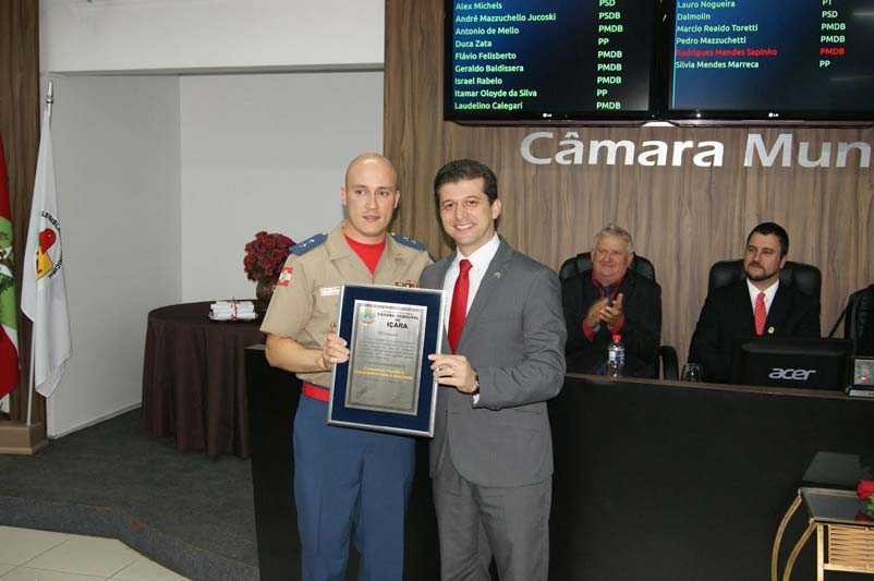 A celebração do aniversário de instalação da 2ª Companhia do 4º Batalhão do Corpo de Bombeiros Militar de Santa Catarina se estendeu também à Câmara Municipal em sessão especial nesta terça-feira, dia 25. Os 15 anos da corporação na cidade foram materializados em uma placa proposta pelo vereador Israel Jorge Rabelo (PMDB). A entrega ocorreu ao comandante, tenente Renan Silvério da Rosa Fernandes.