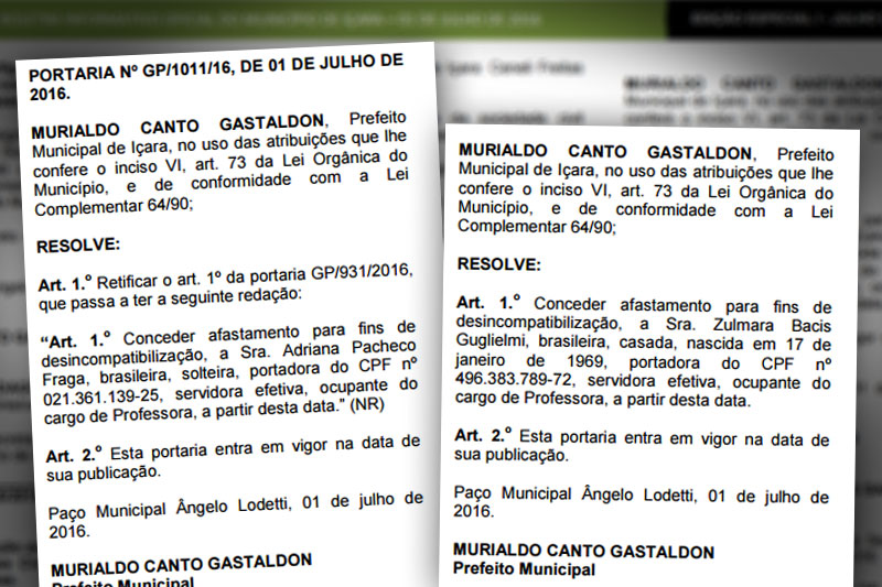 No mesmo prazo - de três meses antes das eleições - também foram exonerados Higor Robetti, Israel Jorge Rabelo, Ademar da Silva Pires, Cristiane de Oliveira Pizzetti, José Fernandes e Sunamita Vieira de Carvalho.A lista foi publicada em uma edição especial do Boletim Informativo Municipal de Içara no mesmo dia das portarias, 1 de julho.