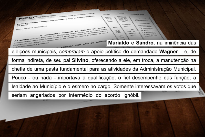 O prefeito Murialdo Canto Gastaldon, o vice Sandro Giassi Serafin, o empresário Silvino Pizzetti e o filho dele, ex-secretário de Obras, Wagner Pizzetti, responderão em conjunto por improbidade administrativa. A denúncia contra eles já foi apresentada pelo promotor Marcus Vinicius de Faria Ribeiro. Mas os réus ainda aguardam notificação. Eles são acusados de desviarem a atuação da Administração Pública ao mercantilizarem um cargo comissionado. O processo é baseado em três notas promissórias assinadas no final da campanha eleitoral de 2012, cada uma correspondente ao salário de secretário municipal, aproximadamente por um ano, de R$ 72 mil.