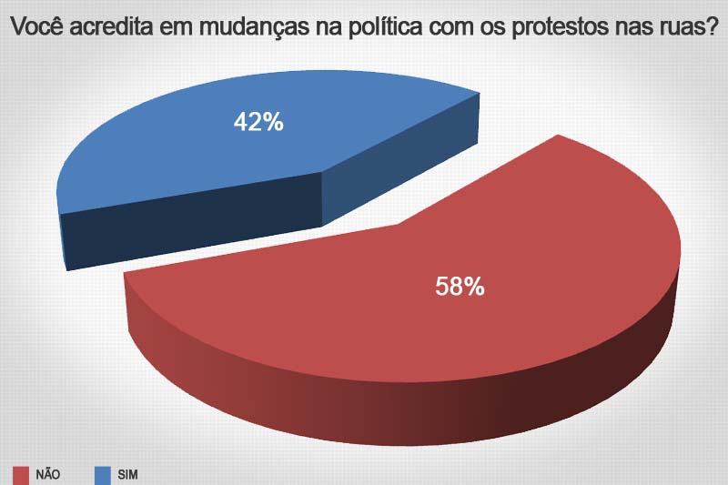 Você acredita em mudanças na política com os protestos nas ruas? Esta pergunta foi realizada pelo Canal Içara de 16 a 23 de março na home page do portal. Dentre 64 internautas participantes, 58% indicaram perspectivas negativas enquanto outros 42% apontaram ter esperanças por alterações.