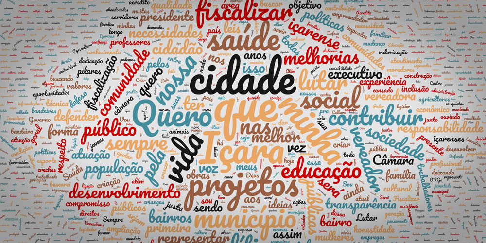 Fiscalização, saúde, desenvolvimento, projetos e contribuições foram algumas das palavras mais presentes na exposição das ideias de 53 candidatos ao Poder Legislativo de Içara. A imagem representa a resposta espontânea ao questionamento: "Como você, candidato(a), pode contribuir com Içara?". Cada participante teve até 500 caracteres (considerando também os espaços) para responder a pergunta no Portal Canal Içara.