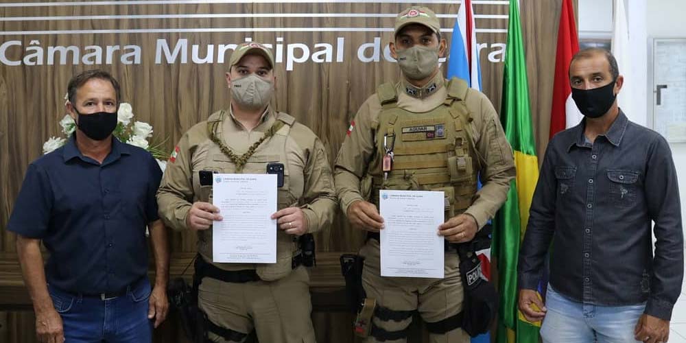 Os policiais militares Ruan Pablo Pelizzari e Ricardo de Castro Aguiar receberam em mãos uma moção de homenagem nesta terça-feira, dia 20. O reconhecimento aprovado em plenário foi realizado pelo salvamento de um recém-nascido que estava em afogamento, no bairro Demboski, no dia 9 de abril.
