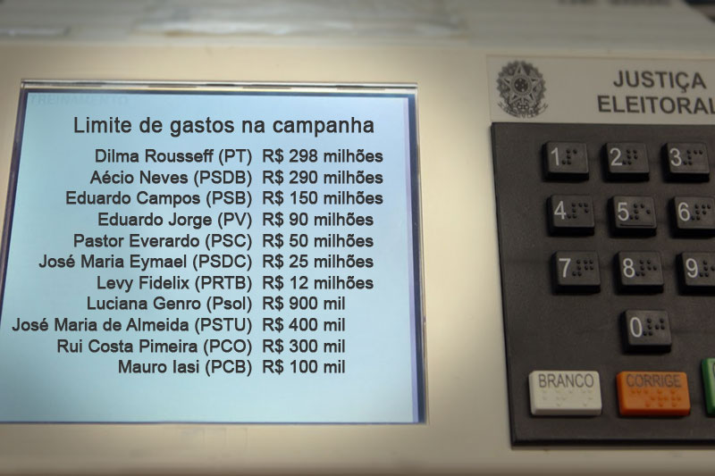 Os 11 candidatos à Presidência da República que concorrem às eleições deste ano informaram ao Tribunal Superior Eleitoral (TSE) que devem gastar juntos R$ 916,7 milhões durante a campanha eleitoral. Se o candidato não respeitar o teto estabelecido, poderá ser condenado a pagar multa de cinco a dez vezes o valor extrapolado. O Supremo Tribunal Federal (STF) chegou a julgar a limitação, por meio da proibição de doações de empresas privadas, em uma ação impetrada pela Ordem dos Advogados do Brasil (OAB). No entanto, após formada a maioria a favor da restrição em abril, o ministro Gilmar Mendes pediu vistas do processo e o julgamento foi interrompido, sem prazo para ser retomado.