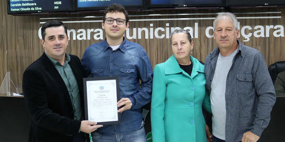 A Câmara Municipal de Içara entregou moção de congratulações a Róger Ghedin Pereira nesta segunda-feira, dia 13, pela conclusão do curso de Engenharia Aeronáutica no Instituto Tecnológico da Aeronáutica (ITA), em São José dos Campos (SP), em 2021. O jovem é o primeiro içarense a receber essa graduação. “Nada mais justo em parabenizar essa brilhante conquista que é um orgulho para nossa cidade. E que seja também inspiração a muitos outros jovens em busca de qualificação e a realização dos seus sonhos”, destacou o autor da moção, o vereador Max Luiz (PL).
