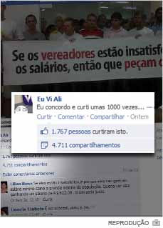 Em quase 24h mais de 1,7 mil perfis curtiram e outros 4,7 mil compartilharam uma foto com içarenses no Legislativo da cidade. O case de viral relembra o protesto contra o aumento do salário entre os parlamentares municipais. A matéria tramitada em abril acabou reprovada após a mobilização de manifestantes com cartazes e faixas, entre elas, uma que foi escolhida pela página Eu vi Ali (www.facebook.com/euviali): "Se os vereadores estão insatisfeitos com os salários, então que peçam demissão".
