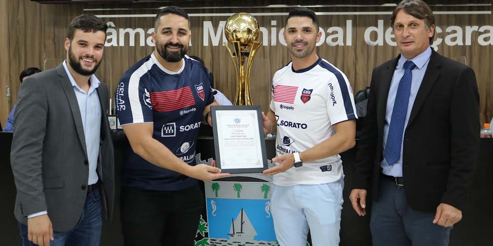 “Um feito espetacular para o time formado em menos de quatro meses, conquistando seu primeiro título e destacando o nome de nosso município”, ressalta Davi. “Parabéns a comissão técnica, diretores, jogadores e torcida por essa importante conquista”, completa Gelson. A moção foi entregue ao diretor de Futebol, Tiago Recco da Silva, e o diretor de Marketing, Diego dos Santos.