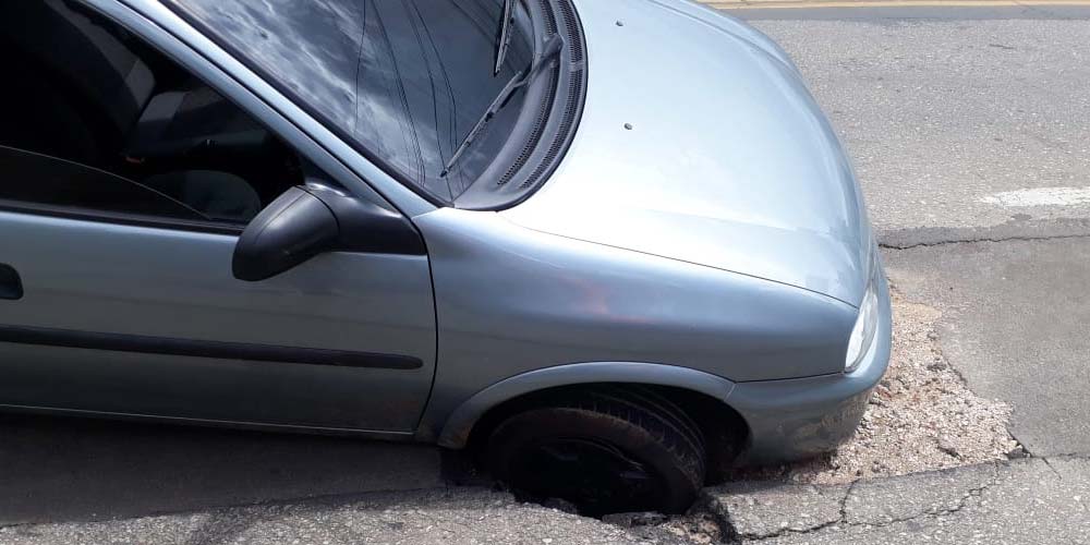 Um Corsa Classic de Içara ficou preso na Rua Sete de Setembro na manhã deste sábado, dia 19. Uma das rodas dianteiras entrou numa abertura do asfalto feita para obra, coberta até então por saibro, mas incompleta pela força da água da chuva nesta semana. Com a queda no buraco, parte da traseira do carro ficou elevada.