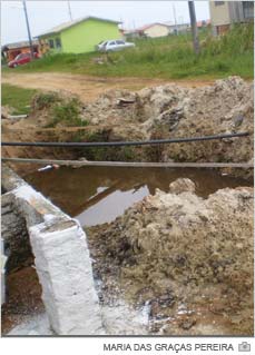 Uma cratera cheia de água preocupa moradores na Zona Sul do Rincão. É que para evitar acidentes, a sinalização da obra na Rua Professor Jair Ribeiro ganhou apenas pedaços de madeira. "Está muito perigoso", exclama Maria das Graças Pereira Vicente.