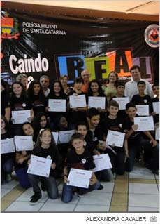 O Programa de Redução às Drogas e à Violência Caindo na Real formou 180 adolescentes do 7º ano na noite de quinta-feira, dia 28. A modalidade do programa acontece pela primeira vez na cidade e já superou as expectativas com os resultados obtidos nas escolas Dimer Pizzetti, Antônio Colonetti, Augusta Bacis e Maria da Glória. Além da entrega dos certificados, a cerimônia teve o sorteio de quatro bicicletas doadas pela Ferrovia Tereza Cristina e uma apresentação da Escola Jéssica Santos com a coreografia Fairy Doll.