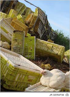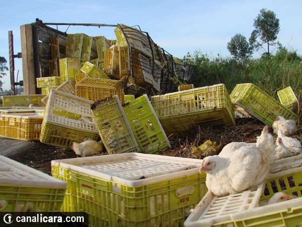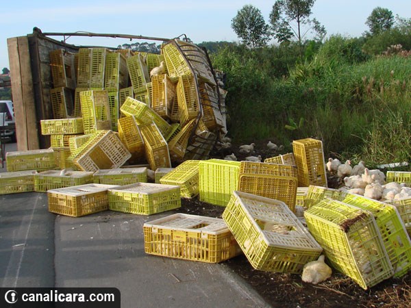 Dezenas de frangos vivos ocuparam a margem da Rodovia Jorge Zanatta após um acidente na manhã desta segunda-feira, dia 7. Os animais eram carregados por um Mercedes Benz L1620 de Criciúma. O caminhão tombou após fazer o contorno na rótula do Anel Viário no bairro Liri, em Içara. Por causa disso, as caixas acabaram abertas. O fato ocorreu por volta das 7h. Quase uma hora depois a Polícia Militar foi então acionada par o registro e o direcionamento do trânsito. O motorista não se feriu.