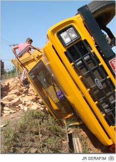 Caminhão de Sangão acabou tombado na tarde desta sexta-feira, dia 19, no trecho da BR-101 em Vila Nova. O veículo seguia no sentido Norte/Sul quando um dos pneus dianteiros estourou e forçou o estacionamento. Todavia, a operação acabou sem sucesso já que virou devido ao peso da carga de telhas. O incidente atingiu então a marginal da rodovia federal, sem interromper o tráfego da BR-101. O fato ocorreu por volta das 15h, sem registro de feridos.