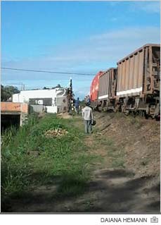 Um caminhão tombou ao passar pela linha férrea e ser atingido pelo trem na tarde desta sexta-feira, dia 9. A colisão ocorreu por volta das 15h no acesso ao bairro Tereza Cristina, em Içara. Com dores no ombro, o motorista rodoviário de 39 anos foi atendido pelo Corpo de Bombeiros e teve encaminhamento ao Hospital São Donato. Conforme a repórter Karol Carvalho, da Rádio Eldorado (AM 570), o acidente provocou também danos na ponte sobre o Rio Içara. Para remover o caminhão foram acionadas duas máquinas.