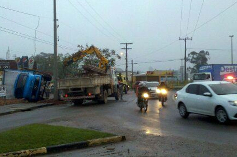 Caminhão tomba na rótula da SC-445