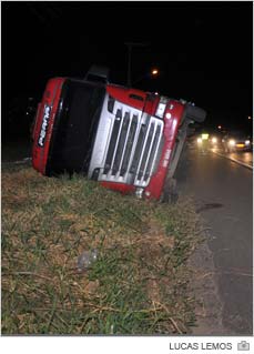 Uma carreta Scania carregada com fritas para cerâmica tombou na Rodovia Deputado Paulino Búrigo (SC-445) nesta quinta-feira, dia 6. O acidente ocorreu próximo ao acesso do bairro Nossa Senhora de Fátima na pista Leste-Oeste por volta das 22h. Conforme apurado pela Polícia Militar Rodoviária, o motorista se perdeu. Com a movimentação da carga, o veículo consequentemente virou.