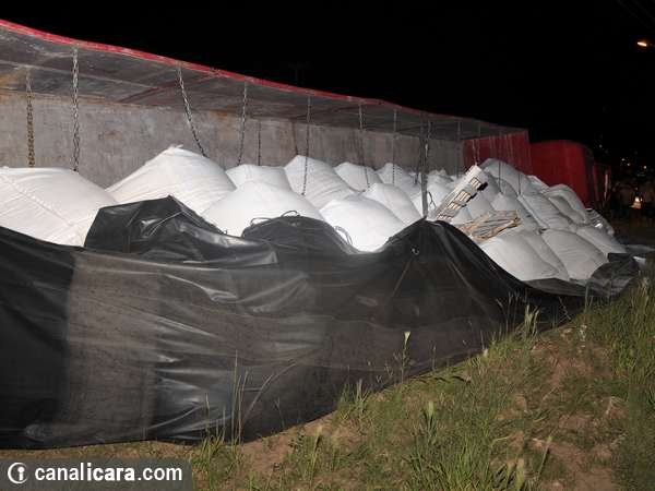 Condutor da Scania, JOR, de 32 anos, teve escoriações na perna e foi atendido pelo Corpo de Bombeiros de Içara. Contudo, recusou o encaminhamento ao hospital. Ao todo ele puxava 32,4 toneladas de fritas que iriam à Bahia no fim de semana. A retirada da carga dividida por sacos começou somente por volta das 23h20 com o uso de uma empilhadeira. Filas foram geradas nos dois sentidos da rodovia.