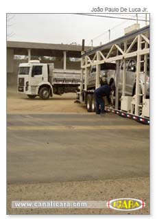 Em sua segunda viagem desde que foi adiquirida pela Ford de Fortaleza, uma cegonheira está trancada na SC-444, desde às 15h, desta sexta-feira, dia 24. O acidente aconteceu próximo ao cruzamento da rodovia com a BR-101, na Vila Nova.