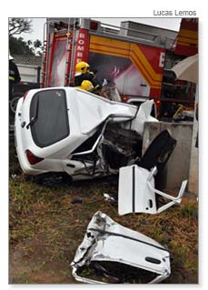 A colisão de um Ford Fiesta de Morro da Fumaça contra uma passagem de pedestres fez vítima fatal E.J.V.R., de 33 anos, por volta das 11h20 desta quinta-feira. Conforme testemunhas, o motorista perdeu o controle do automóvel após frear no trecho de Vila Nova da BR-101. Ao derrapar na pista de sentido Norte/Sul, colidiu então contra a passarela da rodovia federal.