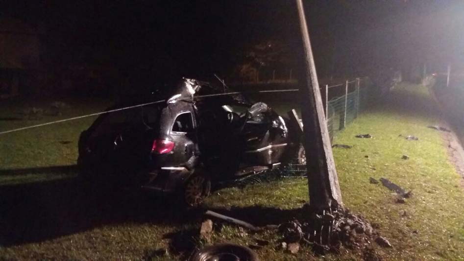 O impacto de um Pálio Wekkend de Guarapuava (PR) partiu um poste ao meio na margem da Rodovia Paulino Búrigo (SC-445) em Sanga Funda por volta das 5h deste sábado, dia 1. Além do veículo de socorro, o Corpo de Bombeiros de Içara deslocou também o caminhão devido a suspeita de encarceramento nas ferragens. Mas a informação não se confirmou. O condutor, de 44 anos, foi removido com sinais vitais alterados e encaminhado ao Hospital São Donato sob suspeita de hemorragia interna. No interior e na parte externa foram encontradas latas de cerveja.