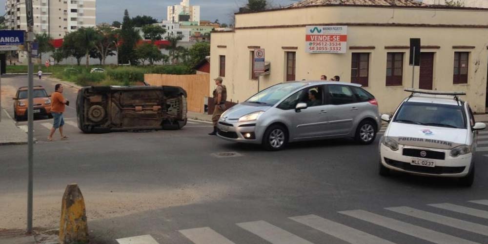 Um Kangoo de Içara tombou na Rua Altamiro Guimarães no início da noite desta sexta-feira, dia 21. O veículo foi atingido na lateral por um Space Fox que estava de passagem pelo cruzamento com a Rua Ipiranga. Apesar do susto e da repercussão devido ao local, não há informações sobre feridos.