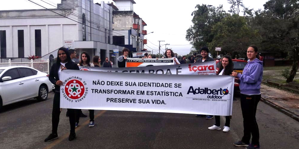Órgãos de segurança, o Poder Público, a iniciativa privada, a sociedade civil organizada e estudantes de Içara ocuparam a Rua Marcos Rovaris para chamar atenção ao trânsito nesta terça-feira, dia 18. O tradicional desfile abriu oficialmente a semana nacional dedicada ao tema com faixas levadas até o Centro de Eventos na Praça do Imigrante, onde ocorreu o cerimonial com a palestra do coronel da Polícia Militar, Márcio José Cabral. Um veículo também foi erguido no local. Já na Praça da Matriz São Donato ficará ao longo desta semana a sucata de um veículo.