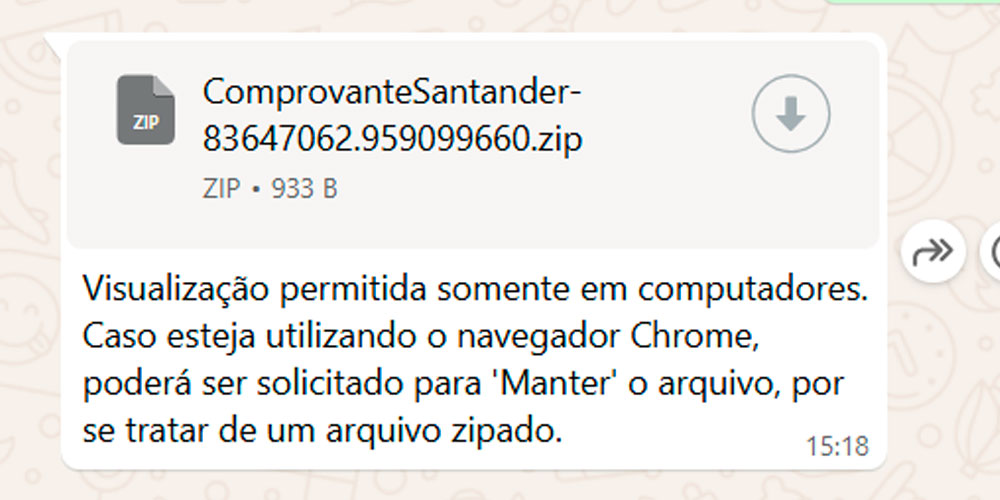 De acordo com o aviso, o vírus é distribuído por meio de um arquivo compactado (.zip) acompanhado da mensagem: “Visualização permitida somente em computadores. Caso esteja utilizando o navegador Chrome, poderá ser solicitado para 'Manter' o arquivo, por se tratar de um arquivo zipado”.