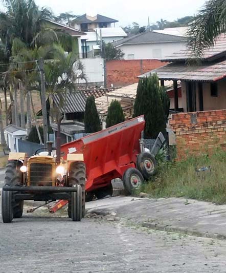 O muro e a grade de uma residência no bairro Primeiro de Maio foram parcialmente atingidas por uma carretinha na tarde desta segunda-feira, dia 11. O equipamento agrícola carregado por um trator se desprendeu na subida da Rua Vitória Meirelles em direção da Rodovia Paulino Búrigo (SC-445). O flagrante do prejuízo - apenas material - foi realizado pelo leitor Juliano Joaquim logo após a colisão.