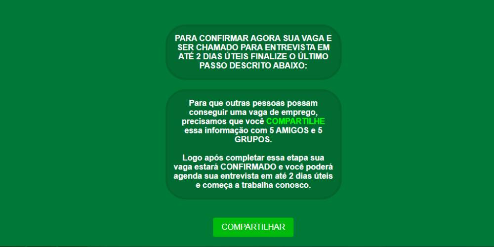 O golpe utiliza-se principalmente do compartilhamento espontâneo pelo WhatsApp. O redirecionamento dos links ocorre para um site que requer nome, data de nascimento e e-mail. A página utiliza inclusive a marca do Atacadão para simular ser um procedimento oficial. Também oferece opções de horário. A condição para a confirmação do cadastro, contudo, é o compartilhamento pelo aplicativo. “A informação é falsa. O processo seletivo ainda não foi aberto”, afirma a rede supermercadista.
