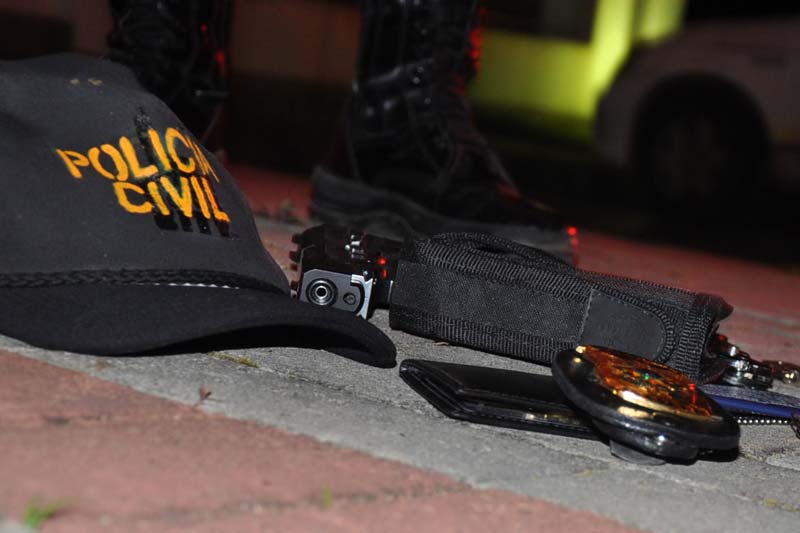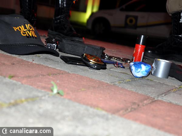 "Ele foi utilizar spray de pimenta e equipamento de choque dentro da guarita. Por legítima defesa, o vigia respondeu então com o disparo", relata o delegado Marcelo Viana. Na jaqueta de Alexandre havia ainda material para produzir uma mordaça e algemas. O falso policial utilizava também um boné pintado com a inscrição da Polícia Civil enquanto o carro em que conduzia estava com a marca e o modelo do veículo tapados com fita. Todo o local foi isolado até o recolhimento do corpo no início da madrugada. Os objetos, por vez, foram recolhidos após a chegada da perícia.