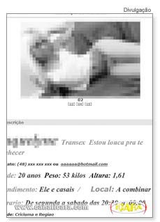 Conforme o Código Penal, até mesmo os anúncios em jornais, revistas e sites, nos quais os serviços são oferecidos estão ilegais e podem ser enquadrados conforme o artigo 230. “Tirar proveito da prostituição alheia, participando diretamente de seus lucros ou fazendo-se sustentar, no todo ou em parte, por quem a exerça”, conforme o Código, é crime, e pode render até seis anos de reclusão. Este mesmo artigo também pode ser aplicado a sites, onde em forma de classificados, pessoas se oferecem para programas eróticos. O acerto é feito através de messengers. Em uma pesquisa realizada pelo Agora, foi encontrado um site, que diz abranger Criciúma e região, disponibiliza fotos, endereços e telefones para contato com as acompanhantes ou modelos. Por constarem como serviço de acompanhantes, não há como provar, se não mediante a uma investigação, que se trata de prostituição, e por isso, o serviço é mantido. A página erótica ainda mostra um exemplo de anúncio (imagem no centro do texto). O valor também é destacado pelo site. Devem ser desembolsados para se manter nos classificados on-line, R$ 60 mensais.