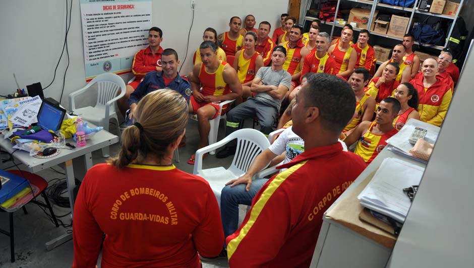 A manhã foi de instrução para bombeiros civis e militares que atuarão no desenvolvimento do Projeto Golfinhos no Litoral Sul de Santa Catarina. Ao todo, 35 pessoas foram recebidas no quartel do Corpo de Bombeiros de Içara para a capacitação do trabalho que será desenvolvido desde as regiões de Tubarão até Passo de Torres. “Todas as cidades litorâneas farão parte”, indica o coordenador do programa no 4º Batalhão, o tenente Arthur Eugênio da Silveira Júnior. Segundo ele, cada praia terá cinco instrutores formados para o trabalho.