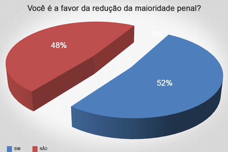 Para 52% dos internautas do Canal Içara é preciso a redução da maioridade penal. Outros 48% consideram que este não é o melhor caminho. A pesquisa foi realizada com uma enquete na capa do portal de 6 a 13 de abril. Ao todo foram registrados 163 votos.