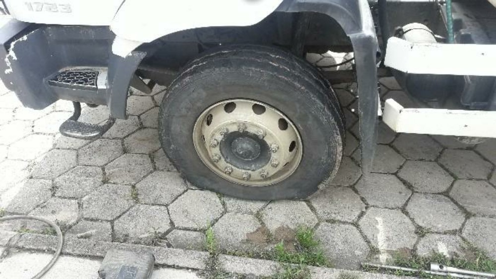 Veículo utilizado por empresa teve o pneu furado e parte da porta danificada