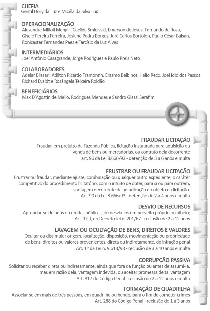 Com menores participações, mas não menos danosas, foram denunciados então Adelar Blissari, Adilton Ricardo Tramontin, Emerson de Jesus, Erasmo Balbinot, Gisele Pereira Ferreira, Helio Reco, Joel Antônio Casagrande, Joel Ídio dos Passos, Jorge Rodrigues, Max Dagostin de Mello, Paulo Preis Neto, Richard Evaldt, Rodrigues Mendes, Rosângela Teixeira Roldão e Sandro Giassi Serafim. Entre os crimes está apropriação de bens ou renda pública; fraude em licitação; corrupção passiva; além de lavagem de bens, direitos ou valores.