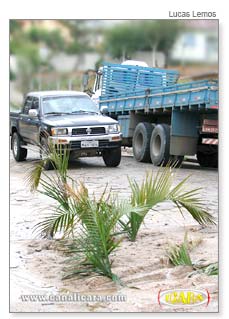 Depois de eliminarem um vazamento de água no Centro de Içara, alguns funcionários do Samae preencheram o cruzamento da Anita Garibaldi com a Antônio Zago com areão. Para evitar o tráfego de veículos, algumas palmeiras foram plantadas no local. E, até agora não foram retiradas para a recolocação das lajotas.