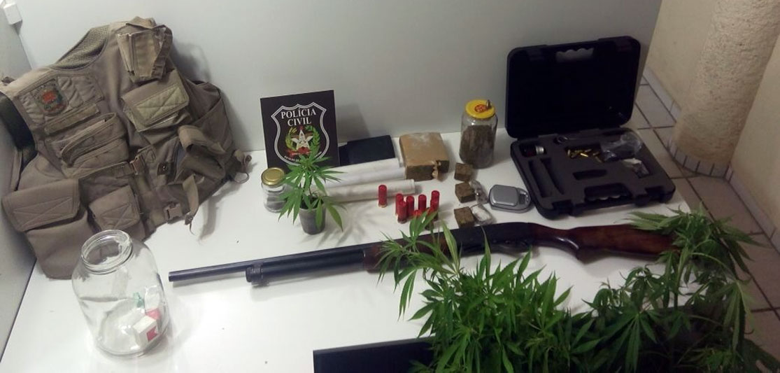 Trinta dias de investigação culminaram nesta semana na apreensão de 1,5kg de maconha, sete pés da planta, além de balança de precisão, uma espingarda de calibre 12, 10 munições de calibre 380 e mais 10 de calibre 12. O material estava com uma mulher presa em flagrante pela Polícia Civil no bairro Nossa Senhora de Fátima na segunda-feira, dia 19.