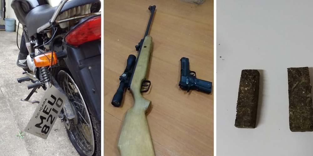 Agentes da Policia Civil da Operação Veraneio e das delegacias do Balneário Rincão e Içara prenderam um casal investigado pela prática de dois homicídios nesta segunda-feira, dia 17. O cumprimento dos mandados de prisão ocorreu no bairro Jaqueline, em Içara, onde foram apreendidos ainda dois adolescentes flagrados no momento em que realizavam a alteração da placa de uma moto furtada em Içara. Também foi recolhida a réplica de uma pistola, uma espingarda com luneta e indícios de adulteração para o disparo de munição calibre 22; além de 67g de maconha em dois torrões.